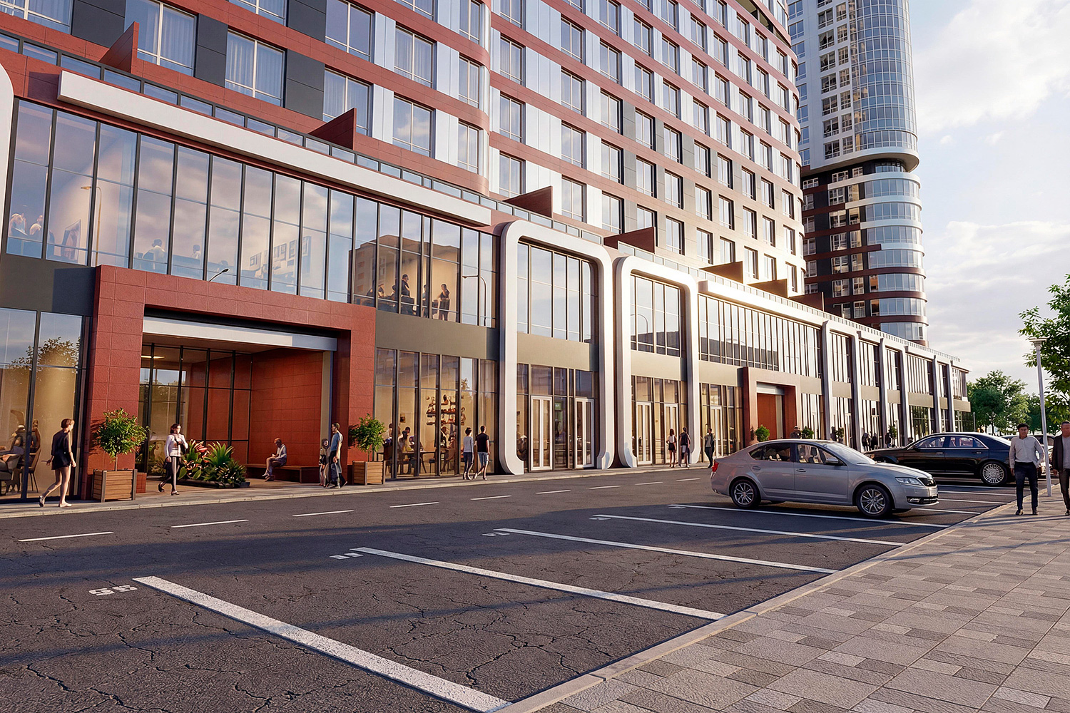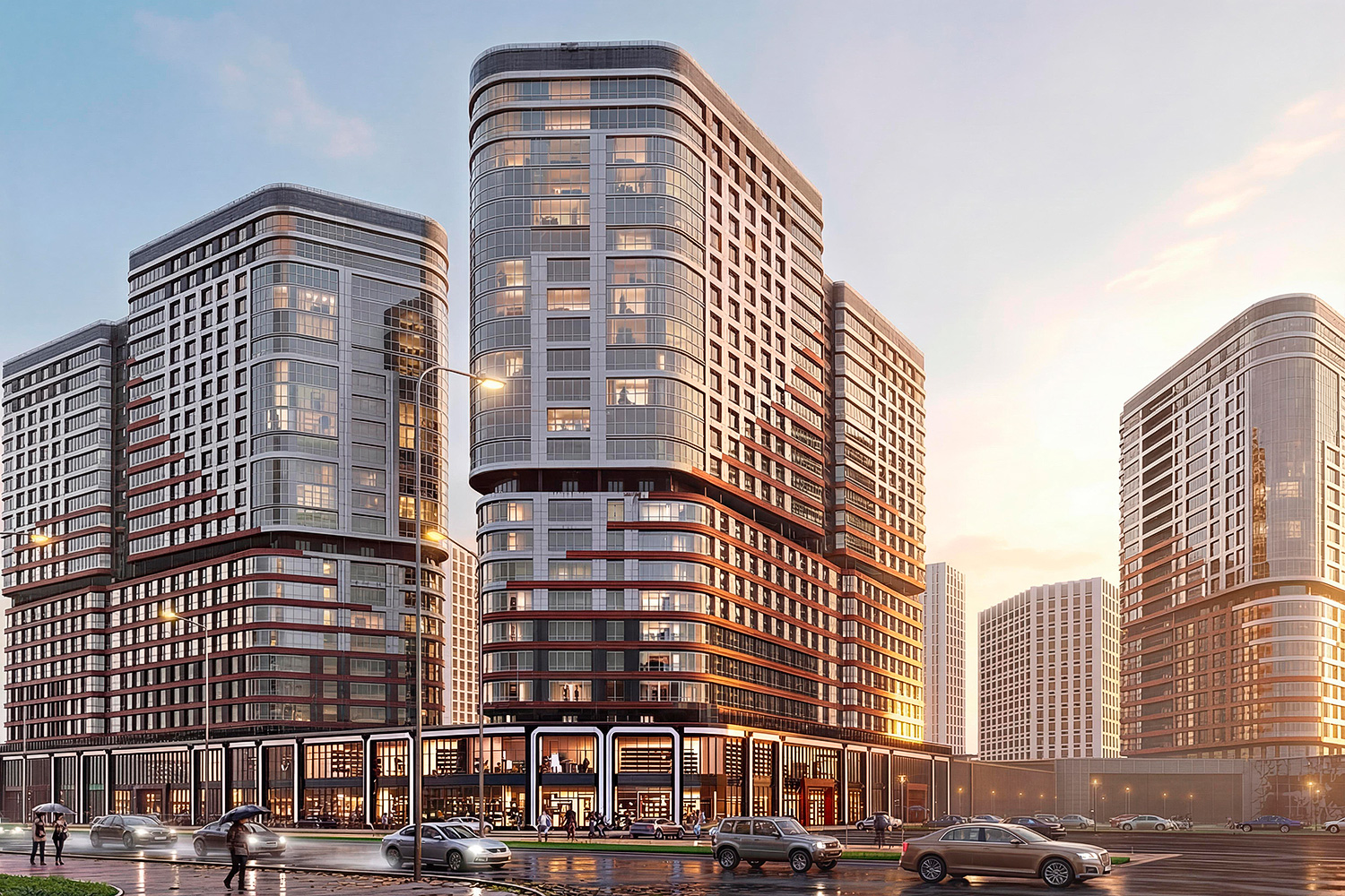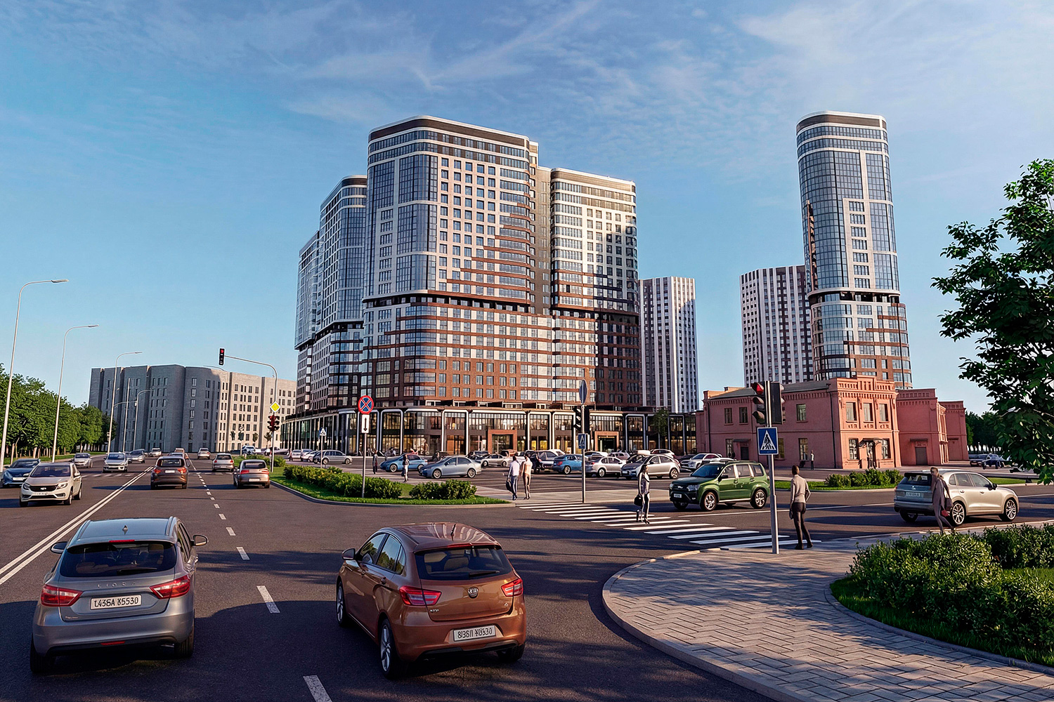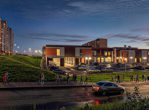 Жилой комплекс повышенной комфортности с выразительным архитектурным решением фасадов зданий. На первых двух этажах размещаются нежилые помещения торгового и офисного назначения. Для комфортного поживания в жилой части комплекса предусматриваются уютные входные группы с ресепшен, колясочные, системы умного дома и подземная автостоянка с выходами непосредственно в лифтовые холлы. Эскизный проект 2021г.
