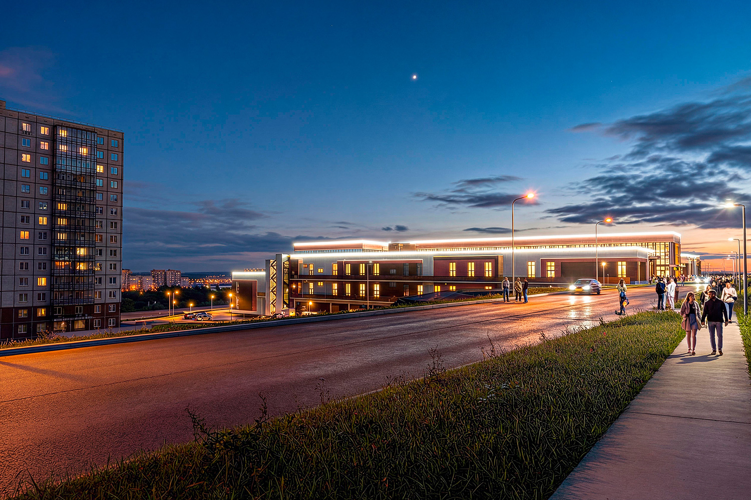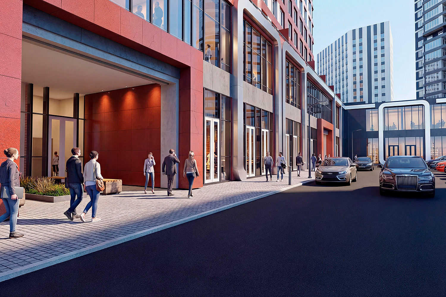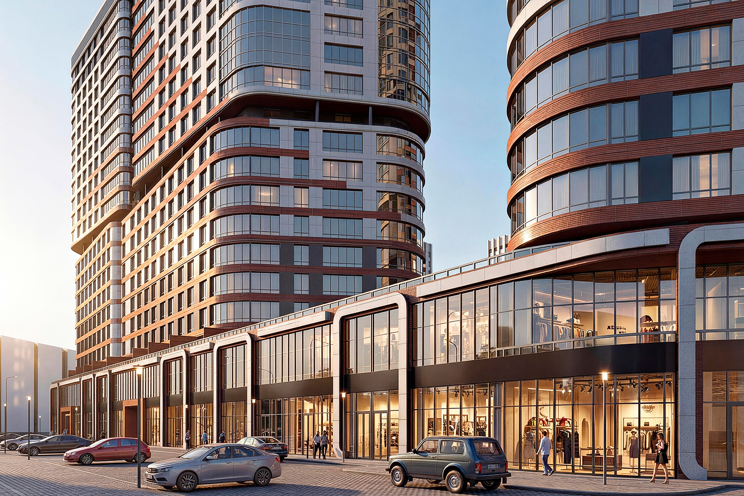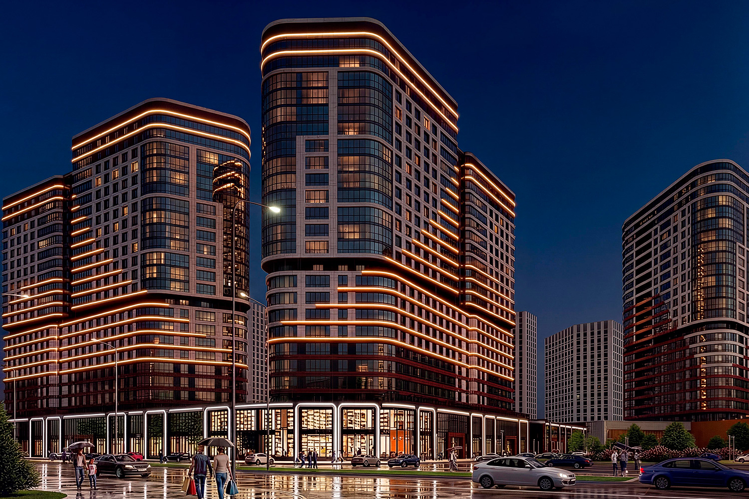 Жилой комплекс повышенной комфортности с выразительным архитектурным решением фасадов зданий. На первых двух этажах размещаются нежилые помещения торгового и офисного назначения. Для комфортного поживания в жилой части комплекса предусматриваются уютные входные группы с ресепшен, колясочные, системы умного дома и подземная автостоянка с выходами непосредственно в лифтовые холлы. Эскизный проект 2021г.