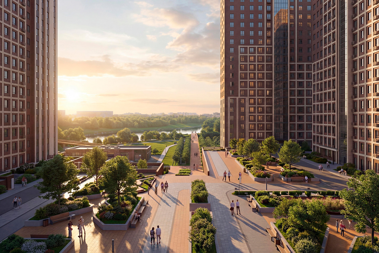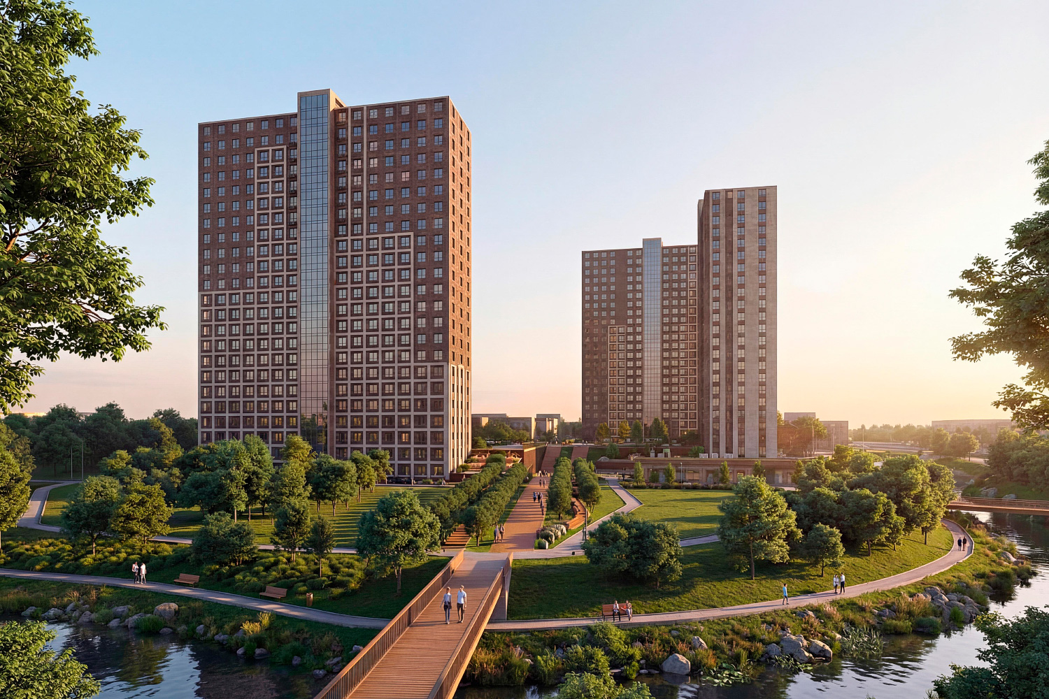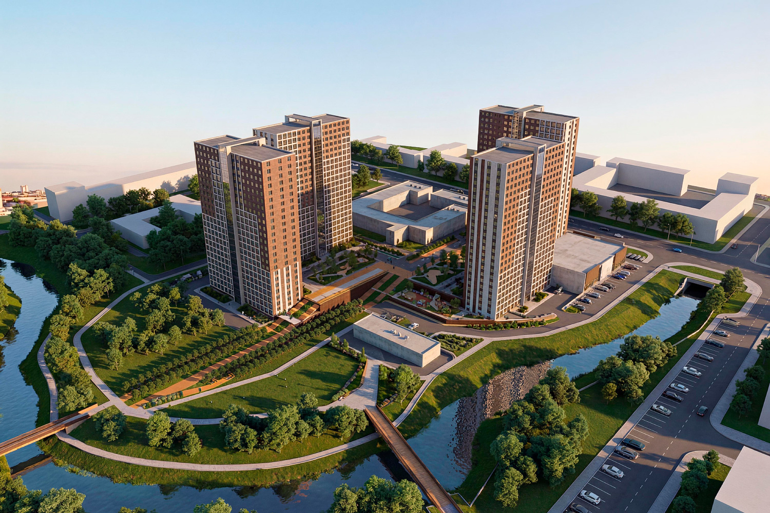 Жилой комплекс воплощает идею пути к реке: архитектура выстраивает последовательный спуск от улицы Калинина к водоёму, задавая пространству особый ритм.